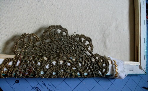 I placed some doilies so they would hang off the edge. When you do this, simply adhere them like you did the rest except let them wrap around the side and then the back as shown here: