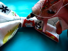 Now this tutorial isn't mine. I borrowed Kate's Bow Tutorial from See Kate Sew, except I did not round the corners as she did and instead of stitching the middle piece of fabric, I just hot glued it, as seen below.